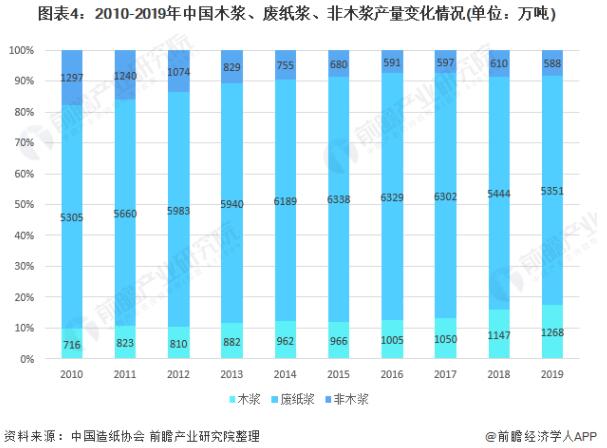另外,根据各类纸浆产量的变化情况,2010-2019年,我国生产的非木浆产量占比不断下降,其产量份额主要被木浆所取代,其主要原因是采用非木浆所生产出来的纸类产品强度和韧度均较低,在人民生活水平日益提高的现今,人们更愿意选择木浆制品。