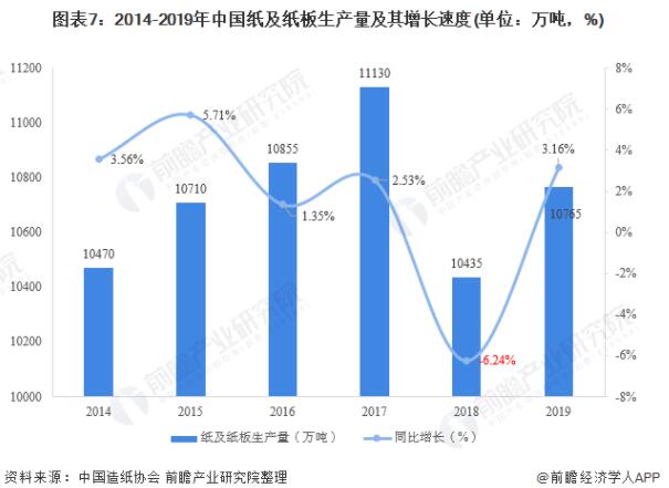 据中国造纸协会统计数据显示,2014年以来,我国纸及纸板产量整体呈现震荡上行趋势,增速保持在低位运行。2017年我国纸及纸板生产量首次突破11000万吨,创历史新高;2018年,受行业景气度下滑影响,整体产量小幅下滑,到2019年,我国纸及纸板生产量有所回升,累计产量为10765万吨,同比增长3.16%。