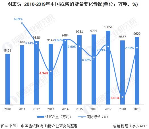 在纸浆消费方面,我国纸浆消费量整体呈上升趋势,整体消费量已达到亿吨级别。2018年,受环保政策趋严影响,我国造纸行业产量下降,对纸浆的消费量也呈现一定幅度的减弱,我国纸浆消费量同比下降6.61%。2019年,我国纸浆消费量实现9606万吨,较2018年增长2.36%。