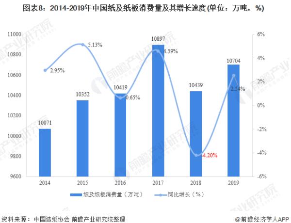 纸及纸板消费方面,据中国造纸协会统计数据显示,2014年以来,我国纸及纸板产量整体呈现震荡上行趋势,增速保持在低位运行。2017年,我国纸及纸板消费量突破11000万吨,创历史新高。