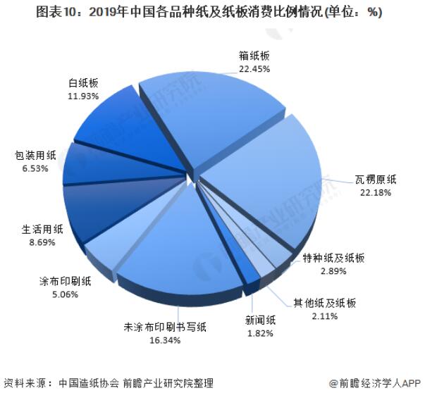 从消费量来看,纸及纸板主要产品的消费量结构与产量结构类似:未涂布印刷书写纸消费量占纸及纸板总消费量的16.34%,箱纸板消费量占纸及纸板总消费量的22.45%,瓦楞原纸消费量占纸及纸板总消费量的22.18%,新闻纸、特种纸和纸板等的消费量占比仍然较小。