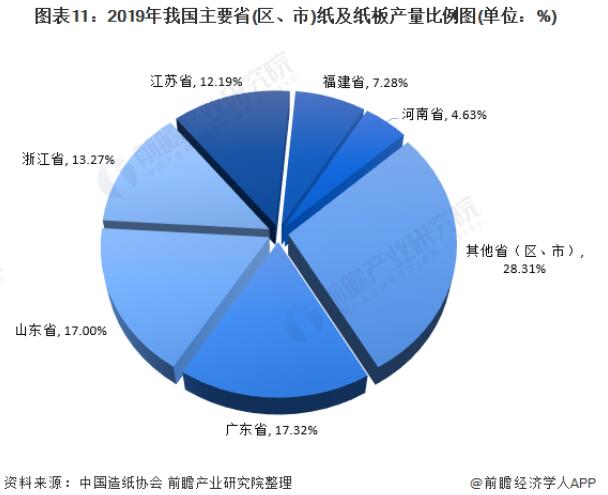 根据中国造纸协会发布的《中国造纸工业2019年度报告》,2019年我国造纸行业产品的产量主要集中在东部地区。2019年广东、山东、浙江、江苏、福建、河南、湖北、安徽、重庆、四川、广西、河北、江西、湖南、天津、海南和辽宁17个省(区、市)纸及纸板产量超过100万吨,产量合计10412万吨,占全国纸及纸板总产量的96.72%。其中广东省和山东省的产量分别达到1864万吨和1830万吨,占比分别达到17.32%和17.00%。