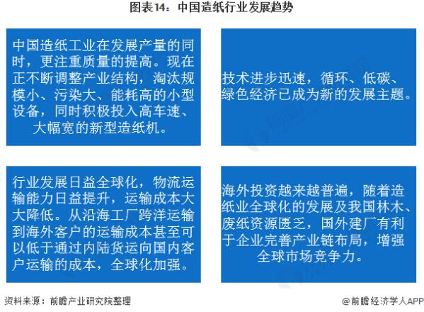 目前,虽然我国造纸行业仍面临着供过于求、行业集中度过低等问题,但其仍在加速产业结构调整。未来我国造纸行业将更注重质量。更关注行业技术创新,企业也将不断走出国门,走向国际。综合来看,中国造纸行业整体发展前景较好。